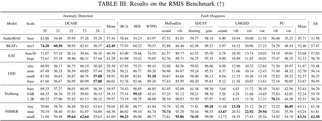 当数据量增大时,模型在所有数据集上均使用相同的 KNN 配置进行推断,RMIS 基准包含 5 个异常检测数据集和 13 个故障诊断数据集,FISHER 大幅超过 BEATs 在内的所有基线,